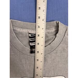 This is a pre-owned Broken Promises T-shirt, size medium. The shirt is gray and features a graphic print of a grim reaper and a woman with the text "FOREVER MEANS NOTHING" and "BROKEN PROMISES". The shirt measures approximately 28 inches in length and 18 inches in width. The material appears to be cotton or a cotton blend. There are no immediately visible stains, tears, or other significant imperfections.