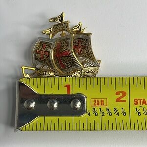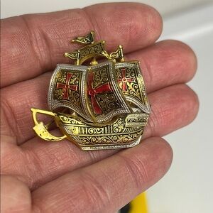 Men's Brooch Pin Gold Tone Boat Red Knights Templar Cross 3D Spanish Discovery