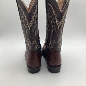 Keywords: Western boots, ostrich skin, men's boots, brown boots, square toe, mid-calf, casual fall boots, exotic leather, detailed stitching, pull-on boots, durable sole, pre-owned boots.