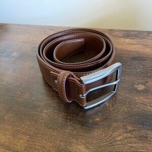 Men’s Brown Stitched Work Belt Genuine Leather Gray Metal Buckle Size 40-42