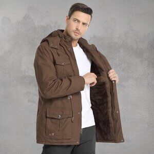 Mens Brown Thick Winter Jacket Hooded Fleece Lined Cotton Military Coat