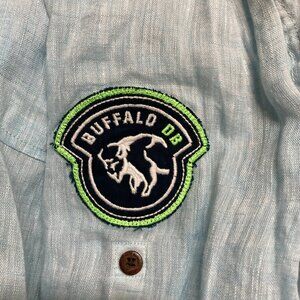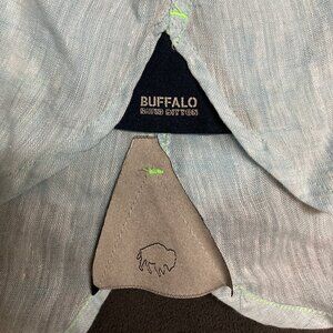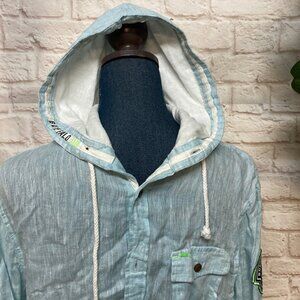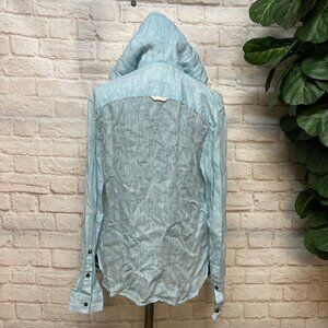 A men's Buffalo by David Bitton lightweight linen shirt with hood. Button front. String tie on hood. Can shorten sleeves. "Buffalo DB" patch on left sleeve. Size small, about 19 inches armpit-to-armpit. 100% linen. Spare button. Rarely worn.