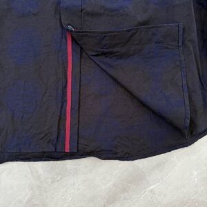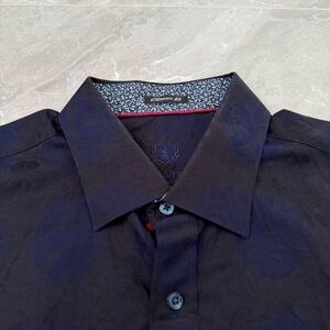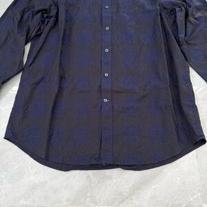 Good condition - Men’s Bugatchi Patterned Long Sleeve Button Down Dress Shirt Classic Fit. Colors: navy blue and black. Size: Does not have size tag, but measurements included (should be a large).
