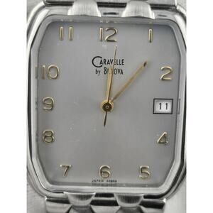 This mens vintage Bulova Caravelle Ultra Slim Elegant Tank Watch is a luxury timepiece designed for men made in 1992. Featuring a sleek silver stainless steel case and bracelet, this quartz watch has a beautiful silver dial with gold numbers that are easy to read, and a date indicator. With a case only 6 mm thick and a 30m water resistance as well as a polished silver finish, this elegant watch is perfect for formal occasions. The watch comes with a fold-over locking closure and a snap caseback, making it a stylish and reliable accessory for any man's collection.