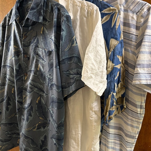 This bundle includes four men's shortsleeve shirts, all of them are size large. The brands included are Pierre Cardin, Tasso Elba, Croft & Barrow and George. No call outs.