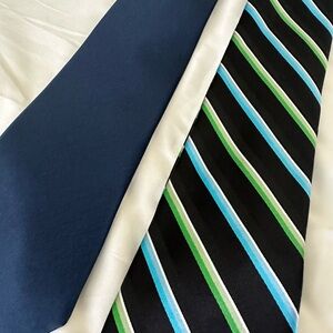 Enhance your wardrobe with these elegant blue ties, crafted from luxurious silk for a smooth finish. The solid navy tie offers a timeless appeal, while the striped design adds a contemporary flair with its harmonious blend of blue tones. Ideal for business or formal occasions, these ties are a staple for any sophisticated ensemble.
