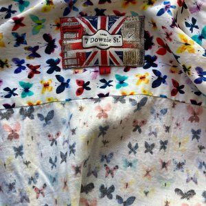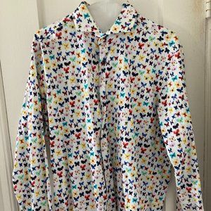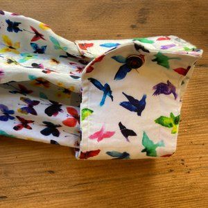 7 Downie St. Men's Butterfly Patterned Sport Shirt. Ability to easily fold a french cuff. Size "4." Comparable to a men's M. About 16-16.5" Neck, 23" Chest. 100% Cotton.