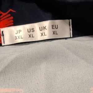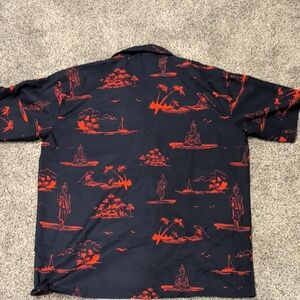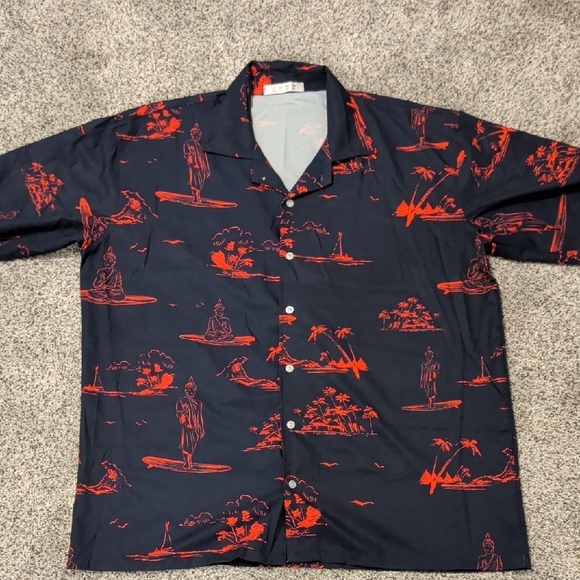 Navy shirt with striking red graphics. Ideal for casual wear.