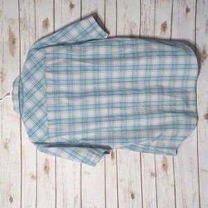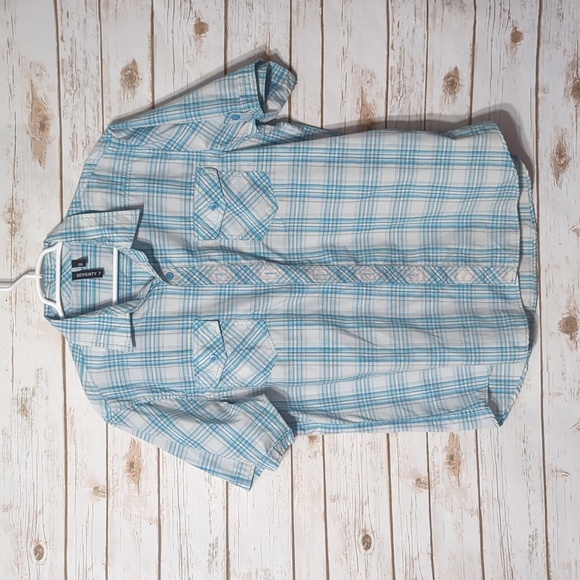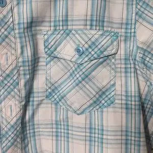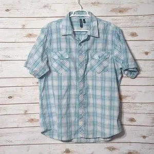 Men's plaid, shirtsleeve button up shirt with two pockets
