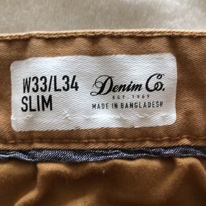 Perfect casual and comfortable. 33 waist and 34 length slim. Denim company. Two flat front pockets two button pockets on the back. Cotton and comfy