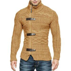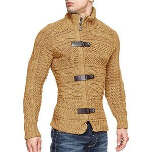 Men's Cable Knitted Oplique Zip Button Front Long Sleeve Cardigan Sweater