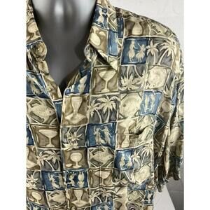 This is a Men's hawaiian shirt by Campia. It is a size L. It is 100% rayon. It is preowned but in excellent condition.It has palm trees, tropical fish, tropical drinks print, short sleeve, left chest pocket.