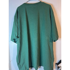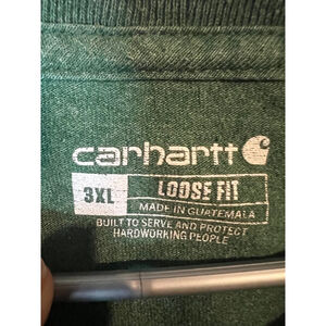 This is a pre-owned Carhartt t-shirt, size 3XL. It features a short-sleeve design and a crew neck. The shirt is green and has a chest pocket with the Carhartt logo. The shirt is made of cotton. There are some white spots on the front of the shirt. The shirt is in acceptable condition.