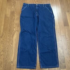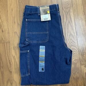 The Men's Carhartt Loose Original Dungaree Fit Carpenter Pants B13-DST in size 40×30 offer a relaxed fit with a straight leg style, perfect for a comfortable and easy-to-wear option for men. Made by the reputable brand Carhartt, these dark wash jeans feature a durable fabric and convenient pockets for added functionality. With a classic blue color and a regular size type, these carpenter pants are ideal for everyday wear and tasks.
