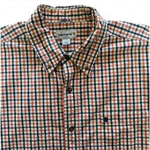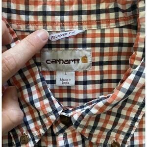 Men’s Carhartt Orange And Navy Plaid Casual Button-up Shirt Sleeve Shirt Size L