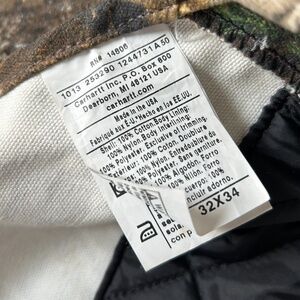 Men's Carharrt hunting overalls with RealTree camo, size 32x34. No marks or wear on the outside, some minor markings on the inside as shown in last picture.