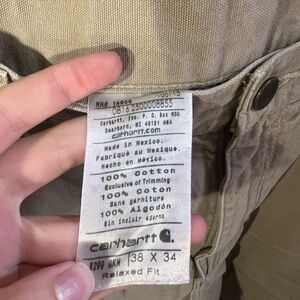 The product is a pair of Men's Carhartt Relaxed Fit cargo pants in khaki tan color, made from 100% cotton material. With a size of 38x34 inches, these pants offer a relaxed fit for comfortable wearing. The cargo style adds functionality and practicality to the classic design, making them a versatile option for everyday wear or outdoor activities. Made by the reputable brand Carhartt, these pants are known for their durability and quality craftsmanship, ensuring long-lasting use.