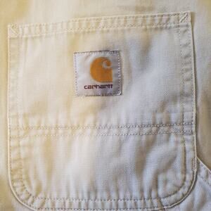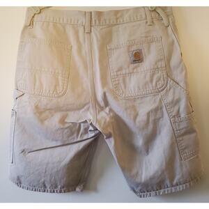 In excellent clean condition. Like new. These Men's Carhartt WIP Ruck Single Knee Shorts in beige are casual trousers perfect for everyday wear. Made of cotton canvas fabric with a mid-rise fit, these Bermuda-style shorts feature a flat front, zip closure, and cargo pockets. The design includes the Carhartt WIP logo as accents, with a solid pattern and a 10-inch inseam. Ideal for outdoor or American-themed occasions, these shorts in size 32 offer both style and functionality for the modern man.
