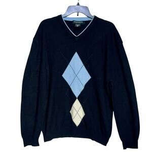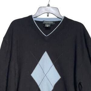 Handsome Hathaway Platinum cashmere sweater in black! This luxurious V-neck pullover features a classic argyle diamond pattern in light blue and cream, perfect for a preppy, sophisticated look. It's in excellent pre-owned condition, ready to add a touch of timeless style to your collection.