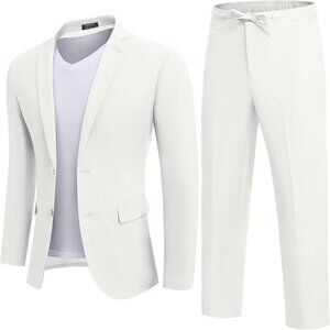 Men's Casual 2 Piece Linen Suit Set - Lightweight Blazer & Pants in White