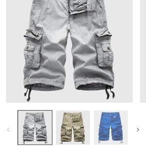 Upgrade your wardrobe with these versatile light weight gray/khaki cargo shorts. Perfect for everyday wear, they offer style and functionality with multiple pockets. Ideal for any casual outing. The sizing is not listed in the waist for this particular brand. Robert Rousseau. But they are between a 34 and 35 waist. My husband got them because he’s tall, but they were a little long for him. They hit right above the knee. They are brand new and never worn