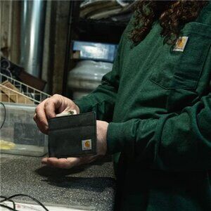 *Keep your ID and essential cards within easy reach. This men's billfold wallet is made of rugged and smooth full-grain leather with a slim design and stitched on Carhartt label