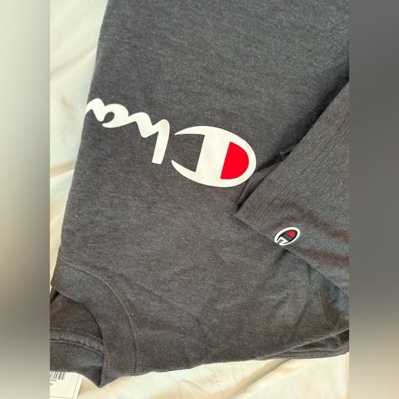 Dark gray crewneck featuring bold Champion logo. Soft and casual style.