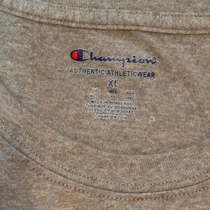 Heather gray t-shirt with Champion logo. Comfortable and stylish.