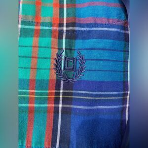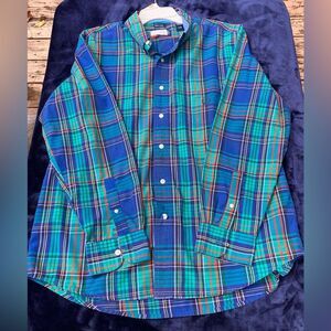 Great looking Chaps Ralph Lauren men’s combo. Large blue green plaid Chaps button up long sleeve shirt, with an XL blue puffer vest also from Chaos. The vest still has the carry pouch attached. Everything is in great shape and a perfect fall outfit!