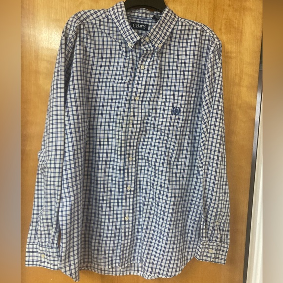Men’s Chaps brand dress shirt. Size XL. 60% cotton and 40% polyester. It’s a slightly thicker, comfortable fabric. Striking blue and white plaid pattern. Great used condition!
