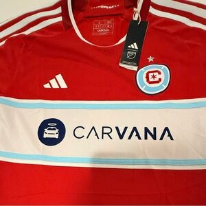 Bold red Adidas soccer jersey. Features white and blue accents. Perfect for fans and players.