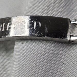 Mens Christian Blessed Cross Engraved Stainless Steel Cuban Chain Bracelet 8.25 inches ***Preowned. Has some light surface scratches.*** Durable and stylish, this stainless steel bracelet features a "Blessed" engraving and cross design. Ideal for daily wear or gifting occasions. • Made Of High-Quality Stainless Steel • Secure Clasp Closure • Engraved "Blessed" With Cross Design