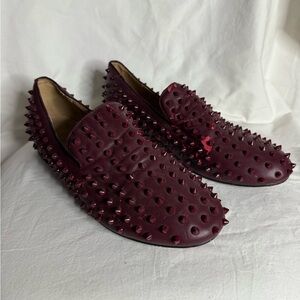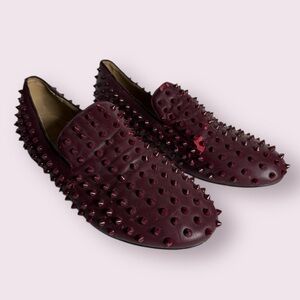 Men’s Christian Louboutin Burgundy Leather Spike Loafers. Burgundy red leather with spike embellishments all over. Slip on loafer style. Color is flaking off, obvious signs of wear, but otherwise good condition. Can take to a cobbler and have them recolored. (Price reflects). Size 44 EU, equivalent to a size 11.