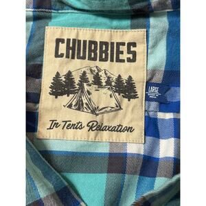 This sale is for one (1) men's Chubbies flannel plaid long sleeve shirt, size L. The shirt is turquoise, blue and white in color.
