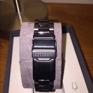 Imported. Eco-Drive solar-powered round watch with rotating elapsed-time inner dial ring and featuring atomic timekeeping with synchronized adjustments in five time zones. Day/date Windows. Worn twice.