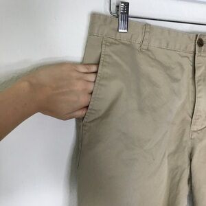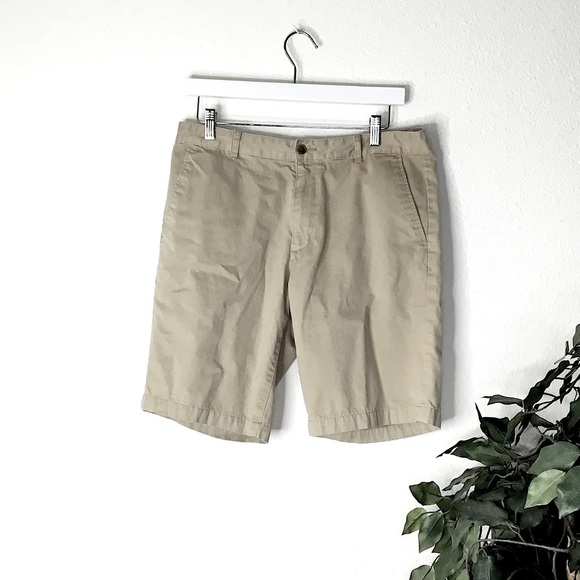 A pair of men’s tan flat front shorts. Front and back pockets. Dress up or down!
