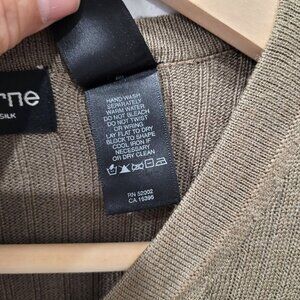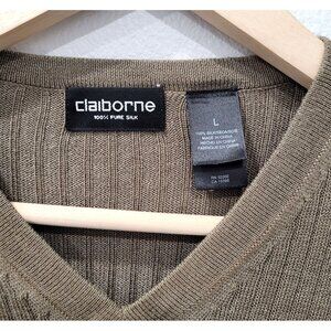 Preowned in like new clean condition. Men's Claiborne V-Neck Pure Silk Pull Over Ribbed Knit Sweater Burnt Sand Size L