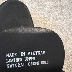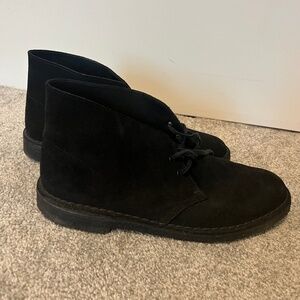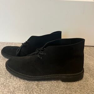 Men's Size 9.5 black Clarks Originals Desert Boot. Constructed from a suede upper, these boots offer a lace-up closure in a round toe silhouette with leather lining and a foam insole for lasting comfort. Two small spots noted on top of right shoe. Came like that in the box. Appears spots could be cleaned off with cleaner.