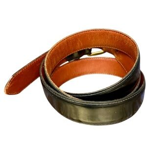 Classic Coach black polished leather belt with solid brass buckle. Perfect for all seasons, this timeless accessory features a sleek black exterior and a rich brown interior. Ideal for both casual and dressy looks.