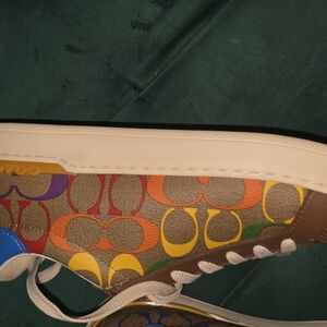 In very good condition .Step out in style with these Coach sneakers, featuring a chic blend of brown and yellow hues. Designed with a vintage-inspired aesthetic, these low-top sneakers boast a playful mix of earth tones and bright accents. Perfect for casual outings, they offer both comfort and a trendy look.