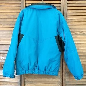 Men's blue, black, and hot pink ski type coat, nylon with polyester fill, 4 front pockets, 3 interior pockets, adjustable/elasticized cuffs and waist. Excellent used condition. Size Medium. Approximate flat measurements: Chest - 24 inches, Length from shoulder to hem - 26 inches, Sleeves Length - 23½ inches.
