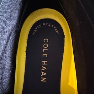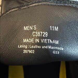 Pre-owned. Weather resistant black leather. These run large in my opinion and will stretch.