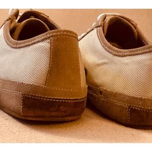 Mens used sneakers in tan cream suede and textile, some spots on textile and scuffed on suede portions leather in soles rubber outsoles