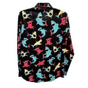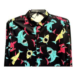 Men’s Colorful Shark Print Button Up Shirt Sz Large Long Sleeves Ocean Novelty