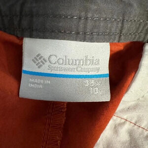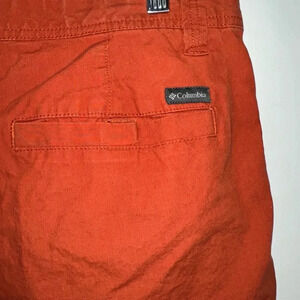 Pre-owned Columbia Sportswear Company men's shorts, size 36W x 30L, made in India. The shorts are rust-orange, 100% cotton, with a button and zipper fly. They feature two front pockets and two back pockets. Minor wear is visible; a small imperfection is present on the back right pocket. Measurements are approximate. The shorts show signs of previous use but remain in good condition.
