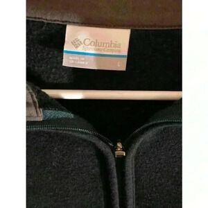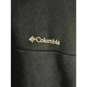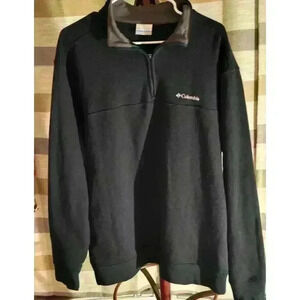 This is a pre-owned Columbia Sportswear Company black 1/4 zip pullover sweatshirt. It is size L and made in Sri Lanka. The sweatshirt has a black body with a brown collar and a black zipper. It has a Columbia logo embroidered on the front right chest and a Columbia Sportswear Company tag sewn on the left side of the front. The sweatshirt is in good condition with no visible tears or holes. There are some minor signs of wear, such as slight fading on the color and some pilling on the fabric. The sweatshirt is made of a soft, comfortable fabric that is perfect for layering in cooler weather.
