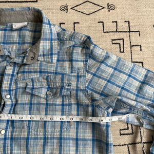 This is a pre-owned Columbia men's plaid button-down shirt. It is blue and white with a size tag that says "M". The shirt is in good condition with no visible flaws. The measurements are: