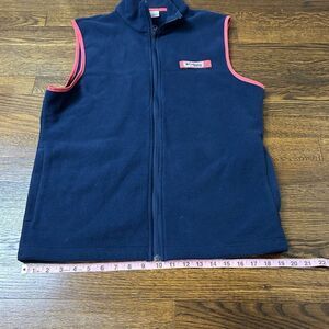 Navy fleece vest with red accents. Full zip closure. Columbia PFG logo on chest and back. Fleece zip up vest. With soft pockets.