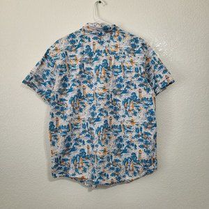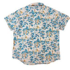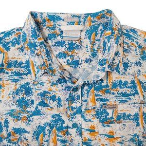 Columbia Sportswear Company - Featuring this cool Rapid Rivers with boat all over print. Short sleeves and button front shirt. Men's regular fit. Front chest pocket. 97% Cotton 3% Elastane. Colors: bright blue, orange, and white. In good pre-owned condition - normal wear, no flaws. Size: Large.
