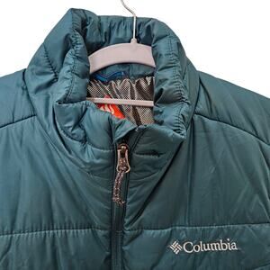 pit 2 pit is 21, length is 27, cinch around bottom, shell is 100% nylon, lining is 100% polyester, insulation is 100% polyester, teal green in color.
